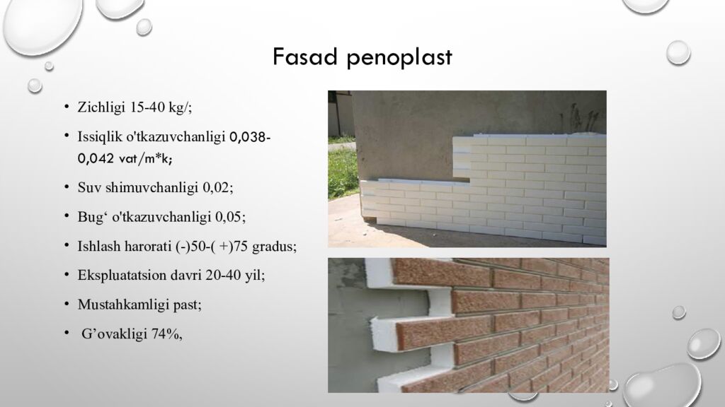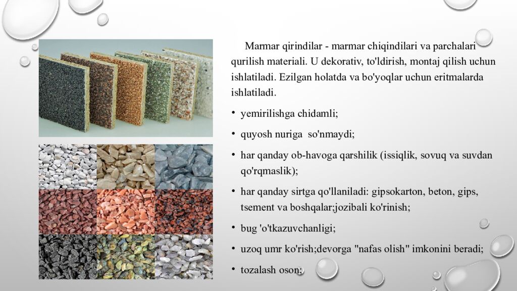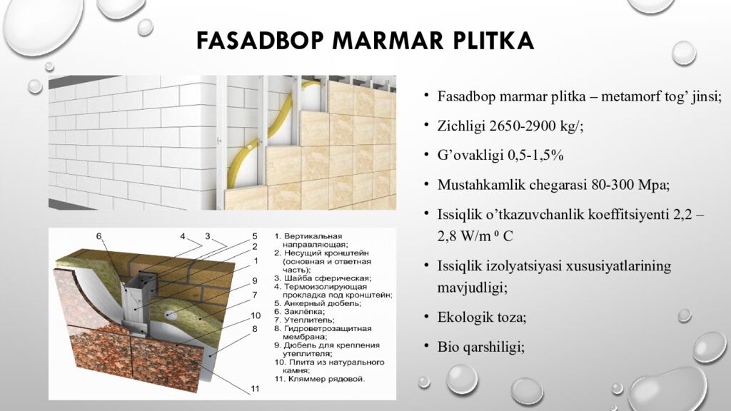 Fasadbop marmar plitka – metamorf tog’ jinsi ; Zichligi 2650-2900 kg/ ; G’ovakligi 0,5-1,5% Mustahkamlik chegarasi 80-300 Mpa ; Issiqlik o’tkazuvchanlik koeffitsiyenti 2,2 – 2,8 W/m ⁰ C Issiqlik izolyatsiyasi xususiyatlarining mavjudligi ; Ekologik toza ; B io qarshiligi ;