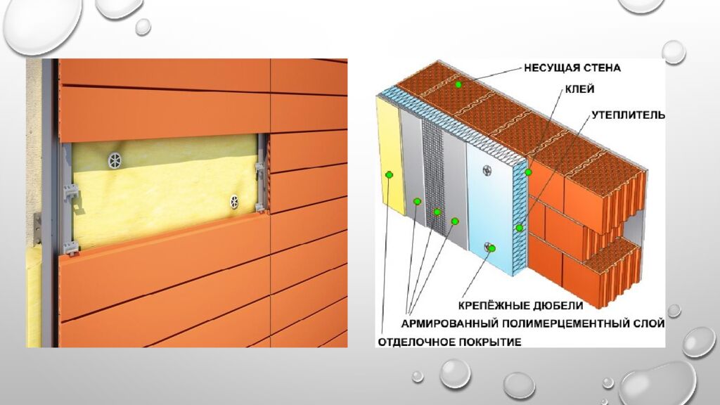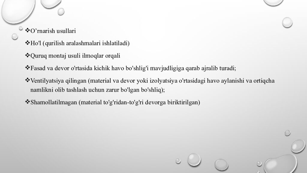 O’rnarish usullari Ho'l ( qurilish aralashmalari ishlatiladi ) Quruq montaj usuli ilmoqlar orqali Fasad va devor o'rtasida kichik havo bo'shlig'i mavjudligiga qarab ajralib turadi ; Ventilyatsiya qilingan (material va devor yoki izolyatsiya o'rtasidagi havo aylanishi va ortiqcha namlikni olib tashlash uchun zarur bo'lgan bo'shliq ); Shamollatilmagan (material to'g'ridan-to'g'ri devorga biriktirilgan )