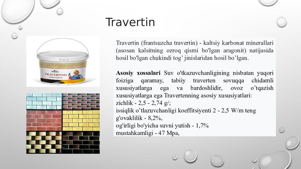 Travertin ( frantsuzcha travertin ) - kaltsiy karbonat minerallari ( asosan kalsitning ozroq qismi bo'lgan aragonit ) natijasida hosil bo'lgan chukindi tog ’ jinislaridan hosil bo’lgan. Asosiy xossalari Suv o'tkazuvchanligining nisbatan yuqori foiziga qaramay, tabiiy traverten sovuqqa chidamli xususiyatlarga ega va bardoshlidir, ovoz o’tqazish xususiyatlarga ega Travertenning asosiy xususiyatlari : z ichlik - 2,5 - 2,74 g/ ; i ssiqlik o’tlazuvchanligi koeffitsiyenti 2 - 2,5 W/m teng g 'ovaklilik - 8,2 %, o g'irligi bo'yicha suvni yutish - 1,7 % mustahkamligi - 47 Mpa,