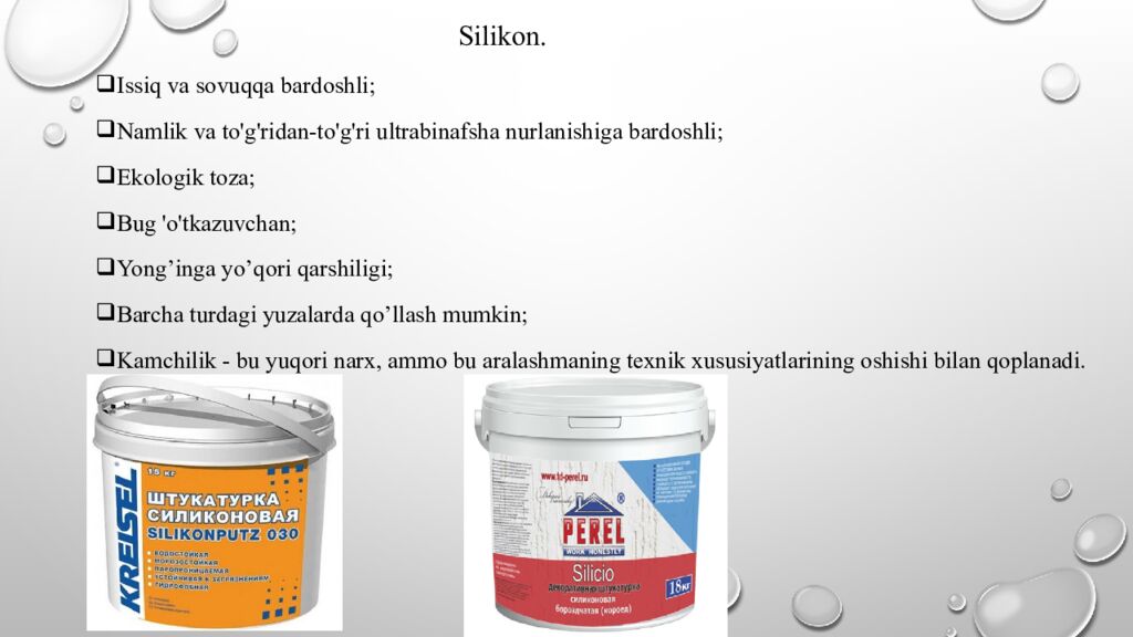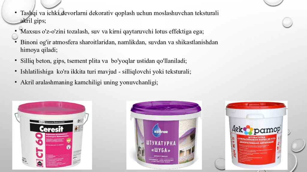 Tashqi va ichki devorlarni dekorativ qoplash uchun moslashuvchan teksturali akril gips ; M axsus o'z-o'zini tozalash, suv va kirni qaytaruvchi lotus effektiga ega ; B inoni og'ir atmosfera sharoitlaridan, namlikdan, suvdan va shikastlanishdan himoya qiladi ; S illiq beton, gips, tsement plita va bo'yoqlar ustidan qo'llaniladi ; I shlatilishiga ko'ra ikkita turi mavjud - silliqlovchi yoki teksturali ; Akril aralashmaning kamchiligi uning yonuvchanligi ;