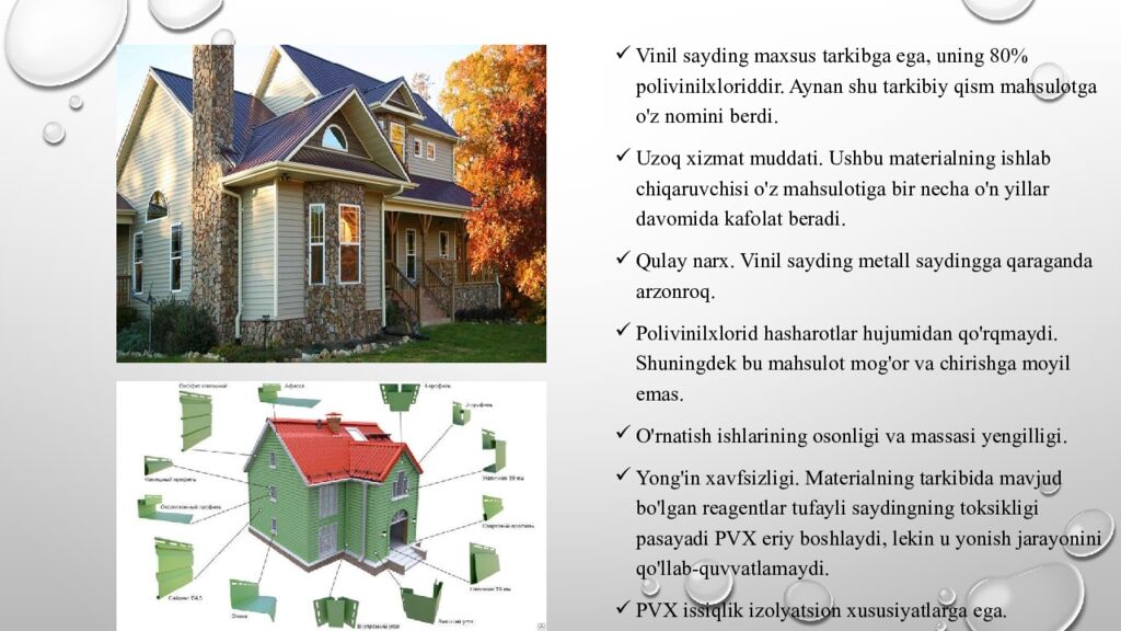 Vinil sayding maxsus tarkibga ega, uning 80% polivinilxloriddir. Aynan shu tarkibiy qism mahsulotga o'z nomini berdi. Uzoq xizmat muddati. Ushbu materialning ishlab chiqaruvchisi o'z mahsulotiga bir necha o'n yillar davomida kafolat beradi. Qulay narx. Vinil sayding metall saydingga qaraganda arzonroq. Polivinilxlorid hasharotlar hujumidan qo'rqmaydi. Shuningdek bu mahsulot mog'or va chirishga moyil emas. O'rnatish ishlarining osonligi va massasi yengilligi. Yong'in xavfsizligi. Materialning tarkibida mavjud bo'lgan reagentlar tufayli saydingning toksikligi pasayadi PVX eriy boshlaydi, lekin u yonish jarayonini qo'llab-quvvatlamaydi. PVX issiqlik izolyatsion xususiyatlarga ega.
