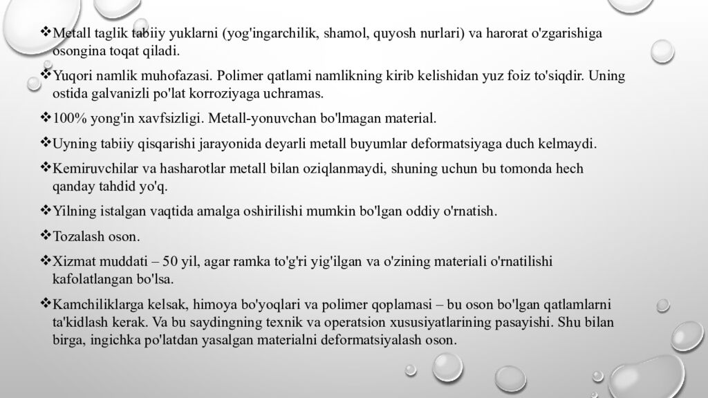 Metall taglik tabiiy yuklarni ( yog'ingarchilik, shamol, quyosh nurlari ) va harorat o'zgarishiga osongina toqat qiladi. Yuqori namlik muhofazasi. Polimer qatlami namlikning kirib kelishidan yuz foiz to'siqdir. Uning ostida galvanizli po'lat korroziyaga uchramas. 100% yong'in xavfsizligi. Metall-yonuvchan bo'lmagan material. Uyning tabiiy qisqarishi jarayonida deyarli metall buyumlar deformatsiyaga duch kelmaydi. Kemiruvchilar va hasharotlar metall bilan oziqlanmaydi, shuning uchun bu tomonda hech qanday tahdid yo'q. Yilning istalgan vaqtida amalga oshirilishi mumkin bo'lgan oddiy o'rnatish. T ozalash oson. Xizmat muddati – 50 yil, agar ramka to'g'ri yig'ilgan va o'zining materiali o'rnatilishi kafolatlangan bo'lsa. Kamchiliklarga kelsak, himoya bo'yoqlari va polimer qoplamasi – bu oson bo'lgan qatlamlarni ta'kidlash kerak. Va bu saydingning texnik va operatsion xususiyatlarining pasayishi. Shu bilan birga, ingichka po'latdan yasalgan materialni deformatsiyalash oson.