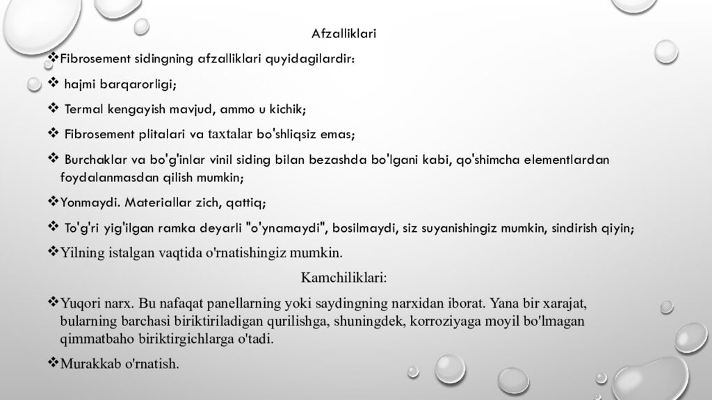 Afzalliklari Fibrosement sidingning afzalliklari quyidagilardir : hajmi barqarorligi ; Termal kengayish mavjud, ammo u kichik ; Fibrosement plitalari va taxtalar bo'shliqsiz emas ; Burchaklar va bo'g'inlar vinil siding bilan bezashda bo'lgani kabi, qo'shimcha elementlardan foydalanmasdan qilish mumkin ; Yonmaydi. Materiallar zich, qattiq ; To'g'ri yig'ilgan ramka deyarli " o'ynamaydi ", bosilmaydi, siz suyanishingiz mumkin, sindirish qiyin ; Yilning istalgan vaqtida o'rnatishingiz mumkin. Kamchiliklari : Yuqori narx. Bu nafaqat panellarning yoki saydingning narxidan iborat. Yana bir xarajat, bularning barchasi biriktiriladigan qurilishga, shuningdek, korroziyaga moyil bo'lmagan qimmatbaho biriktirgichlarga o'tadi. Murakkab o'rnatish.