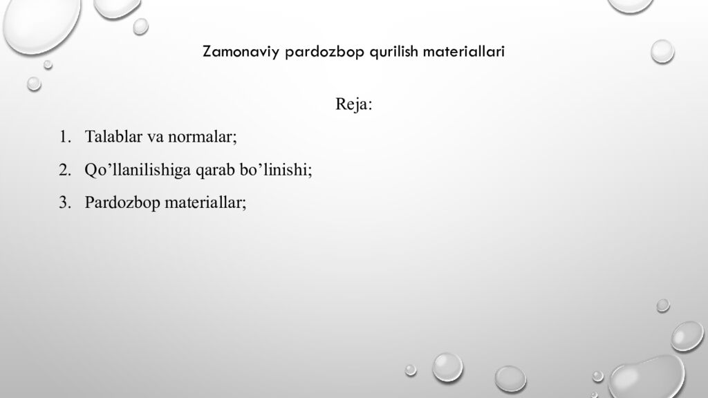 Reja : Talablar va normalar ; Qo’llanilishiga qarab bo’linishi ; Pardozbop materiallar ;