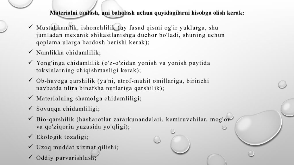Mustahkamlik, ishonchlilik ( uy fasad qismi og'ir yuklarga, shu jumladan mexanik shikastlanishga duchor bo'ladi, shuning uchun qoplama ularga bardosh berishi kerak ); Namlikka chidamlilik ; Yong'inga chidamlilik ( o'z-o'zidan yonish va yonish paytida toksinlarning chiqishmasligi kerak ); O b- havoga qarshilik ( ya'ni, atrof-muhit omillariga, birinchi navbatda ultra binafsha nurlariga qarshilik ); Materialning shamolga chidamliligi ; Sovuqqa chidamliligi ; Bio- qarshilik ( hasharotlar zararkunandalari, kemiruvchilar, mog'or va qo'ziqorin yuzasida yo'qligi ); Ekologik tozaligi ; Uzoq muddat xizmat qilishi ; Oddiy parvarishlash ;