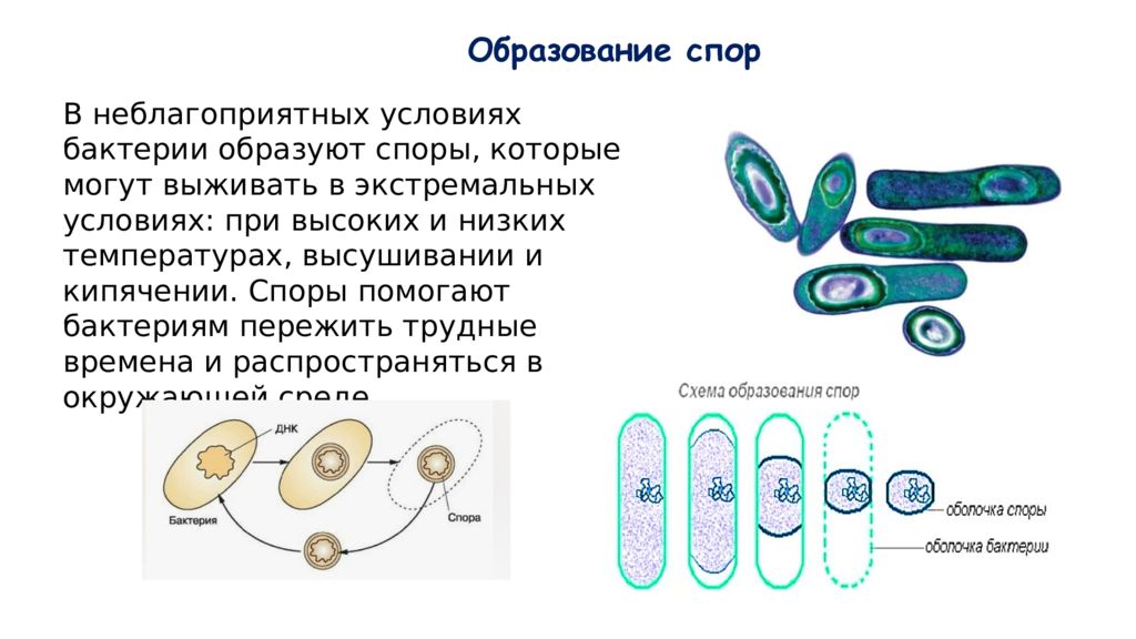 В неблагоприятных условиях бактерии образуют споры, которые могут выживать в экстремальных условиях: при высоких и низких температурах, высушивании и кипячении. Споры помогают бактериям пережить трудные времена и распространяться в окружающей среде. Образование спор