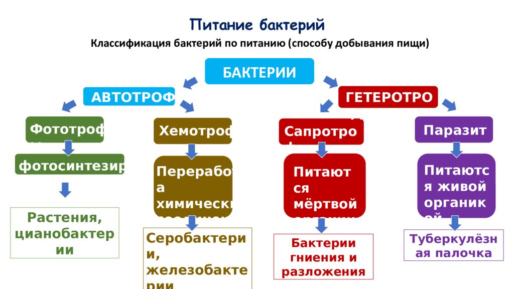 Питание бактерий Классификация бактерий по питанию (способу добывания пищи) АВТОТРОФЫ ГЕТЕРОТРОФЫ Фототрофы Хем отрофы С апротрофы Паразиты БАКТЕРИИ фотосинтезируют Переработка химических соединений Питаются мёртвой органикой Питаются живой органикой Растения, цианобактерии Серобактерии, железобактерии Бактерии гниения и разложения Туберкулёзная палочка