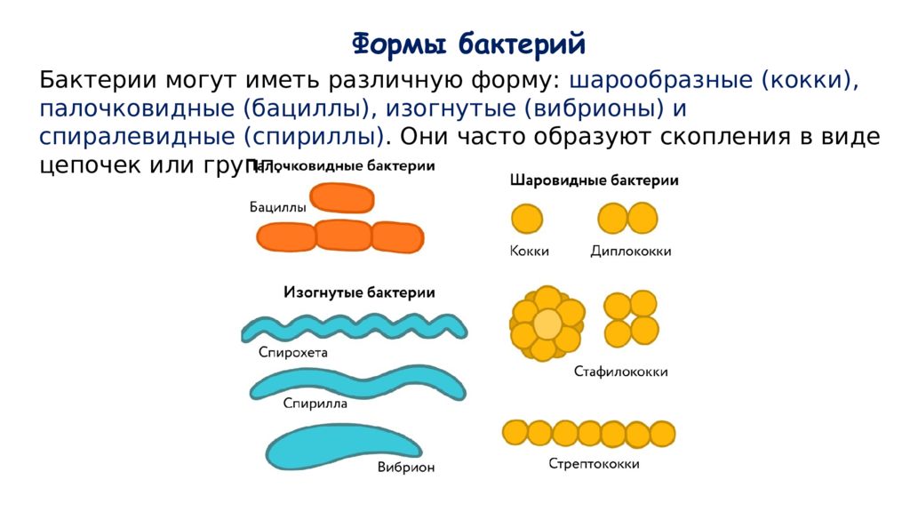 Бактерии могут иметь различную форму: шарообразные (кокки), палочковидные (бациллы), изогнутые (вибрионы) и спиралевидные (спириллы). Они часто образуют скопления в виде цепочек или групп. Формы бактерий