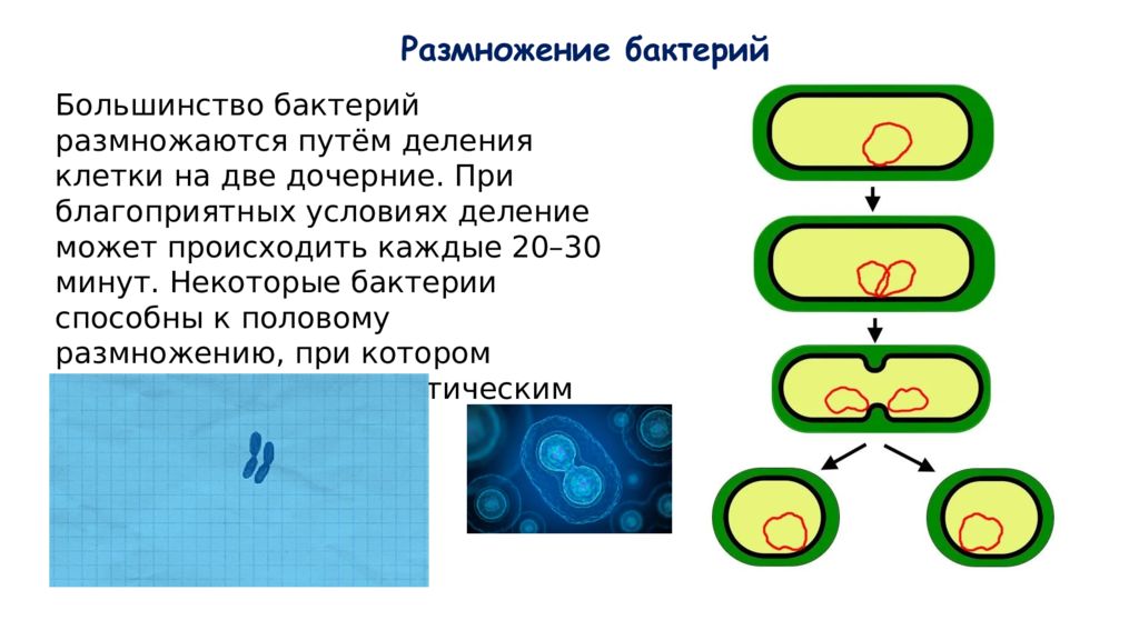 Большинство бактерий размножаются путём деления клетки на две дочерние. При благоприятных условиях деление может происходить каждые 20–30 минут. Некоторые бактерии способны к половому размножению, при котором происходит обмен генетическим материалом. Размножение бактерий
