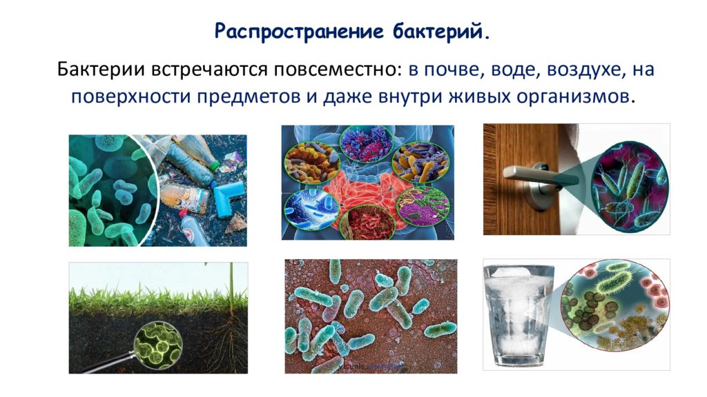 Распространение бактерий. Бактерии встречаются повсеместно: в почве, воде, воздухе, на поверхности предметов и даже внутри живых организмов.