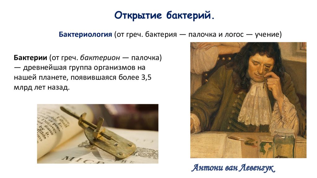 Открытие бактерий. Бактерии (от греч. бактерион — палочка) — древнейшая группа организмов на нашей планете, появившаяся более 3,5 млрд лет назад. Бактериология (от греч. бактерия — палочка и логос — учение) Антони ван Левенгук