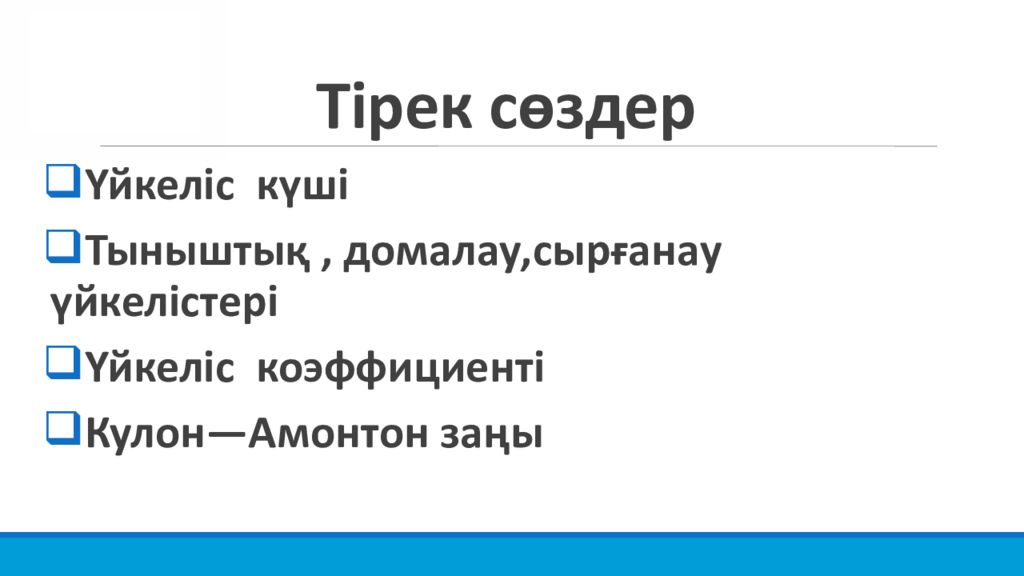 Үйкеліс күші Тыныштық, домалау,сырғанау үйкелістері Үйкеліс коэффициенті Кулон— Амонтон заңы