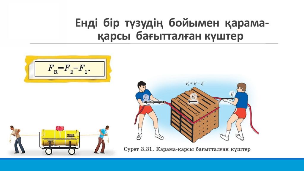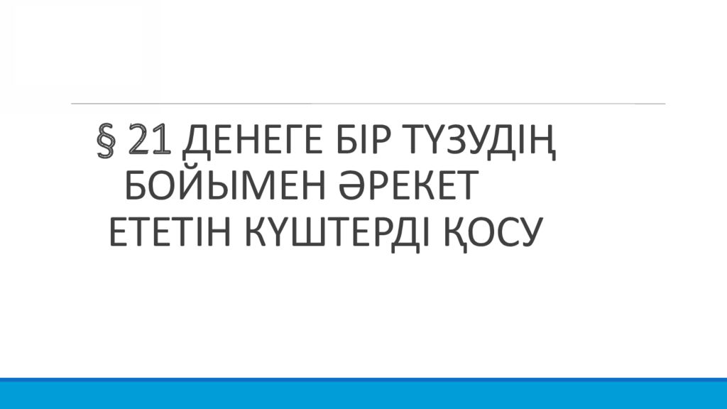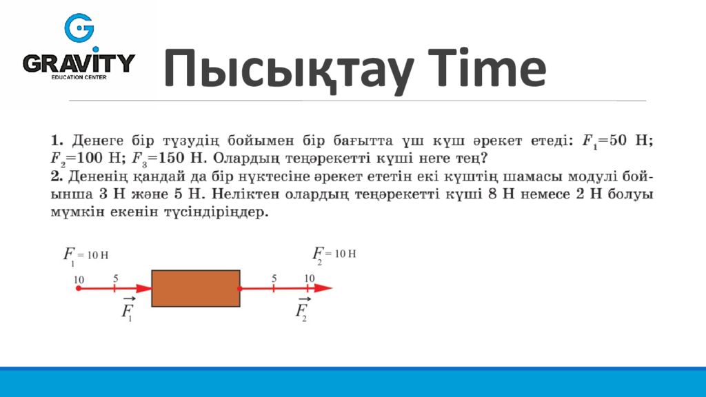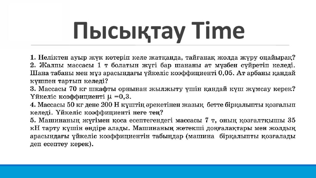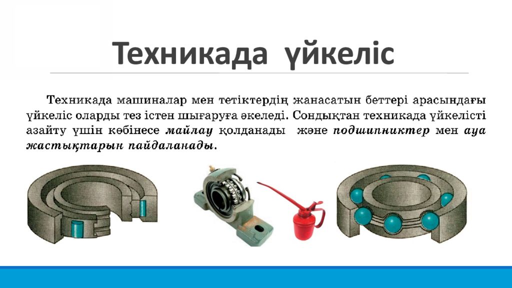 Анықтамасы Бір дене екінші дененің бетімен қозғалған кезде пайда болатын күш үйкеліс күші деп аталады Пайда болу себептері -жанасатын беттердің кедір-бұдырлығы; - жанасатын беттер молекулаларының өзара тартылысы; Үйкеліс түрлері -сырғанау (шаңғышы қар бетімен сырғанағанда) -тыныштық (денелер бір-біріне қатысты тыныштық қалпын сақтаса) -домалау(доңғалақтардың айналуы жағдайында) Белгіленуі F үйк Өлшем бірлігі 1Н Бағыты Қозғалысқа қарама-қарсы Есептелетін формуласы F үйк =µN. Неге тәуелді? (Фактролар, шамалар) - жанасатын беттердің қандай материалдан жасалғанына - жанасатын беттердің өңделі сапасына - бір беттің екінші бетке түсіретін қысым күшіне Өзіңді тексер!