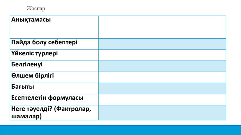 Анықтамасы Пайда болу себептері Үйкеліс түрлері Белгіленуі Өлшем бірлігі Бағыты Есептелетін формуласы Неге тәуелді? (Фактролар, шамалар)