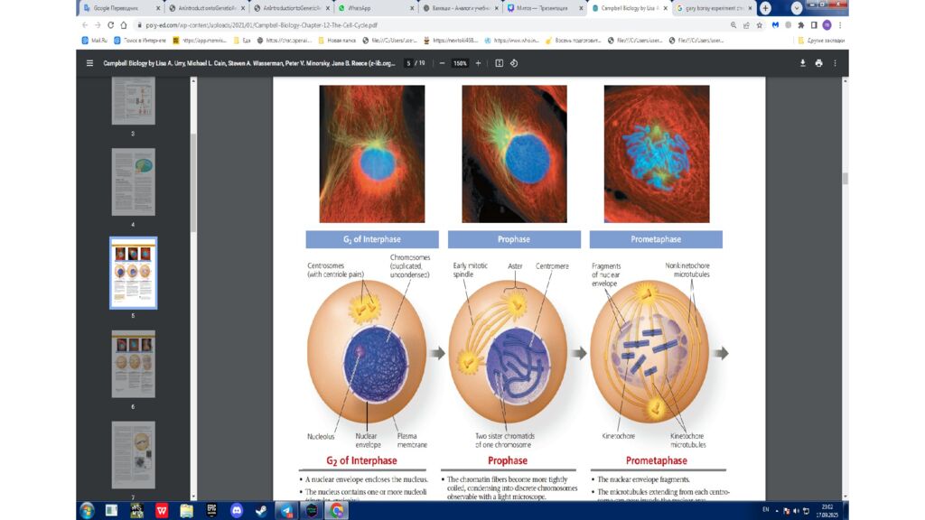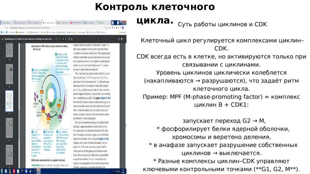 К онтроль клеточного цикла. Суть работы циклинов и CDK Клеточный цикл регулируется комплексами циклин–CDK. CDK всегда есть в клетке, но активируются только при связывании с циклинами. Уровень циклинов циклически колеблется (накапливаются → разрушаются), что задаёт ритм клеточного цикла. Пример: MPF (M-phase-promoting factor) = комплекс циклин B + CDK1: запускает переход G2 → M, * фосфорилирует белки ядерной оболочки, хромосомы и веретено деления, * в анафазе запускает разрушение собственных циклинов → выключается. * Разные комплексы циклин–CDK управляют ключевыми контрольными точками (**G1, G2, M**).