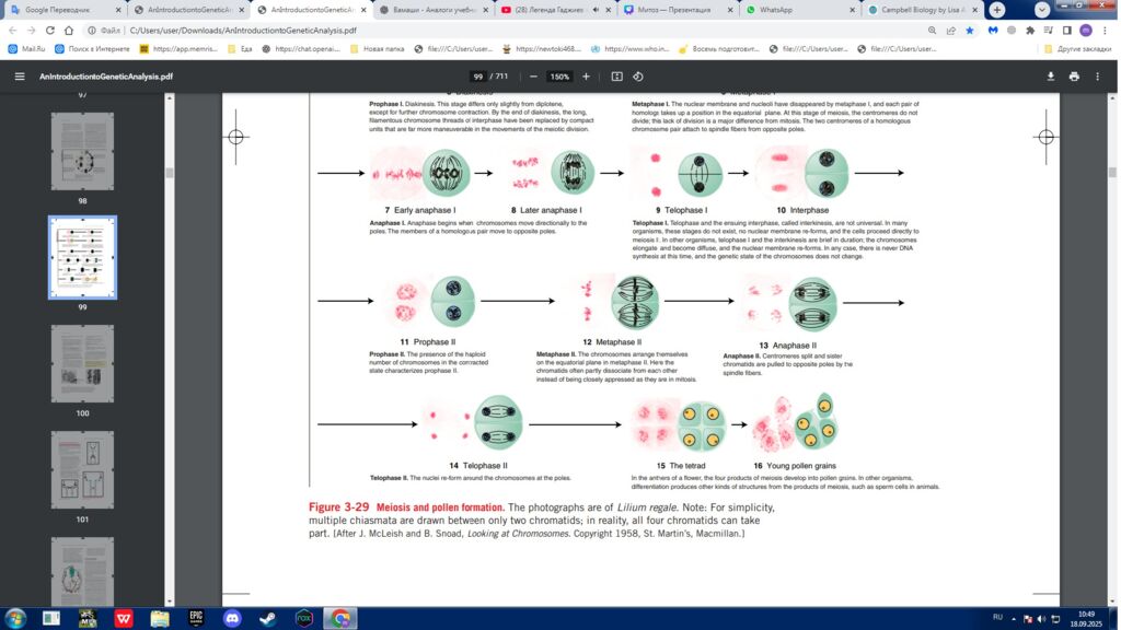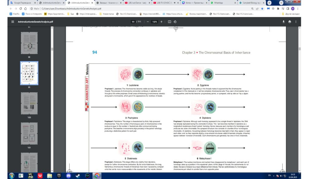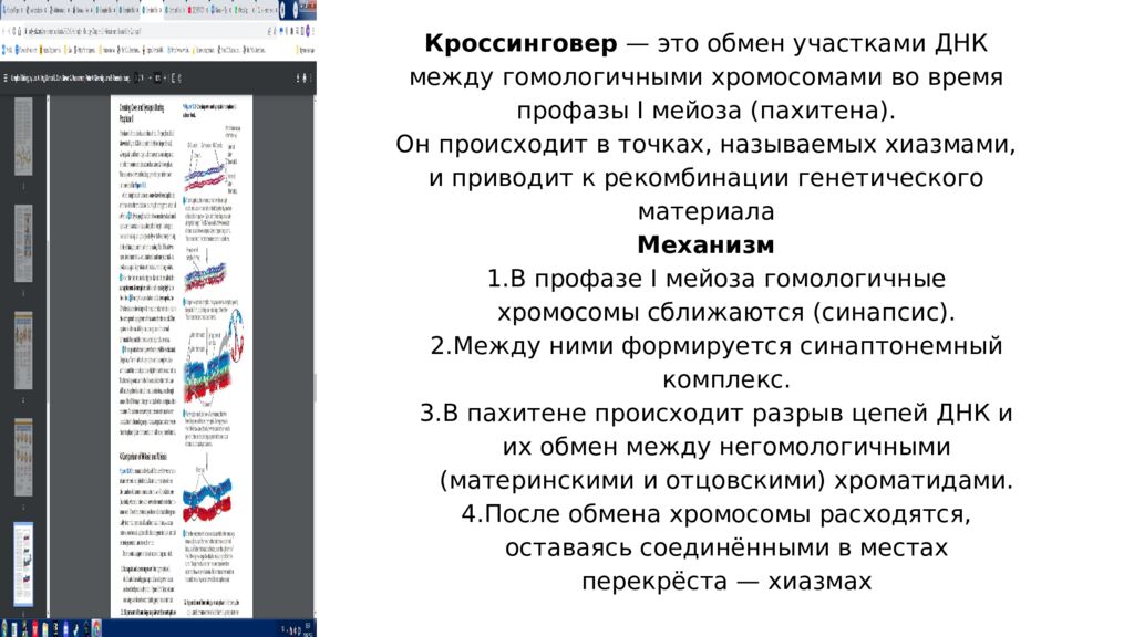 Кроссинговер — это обмен участками ДНК между гомологичными хромосомами во время профазы I мейоза (пахитена). Он происходит в точках, называемых хиазмами, и приводит к рекомбинации генетического материала Механизм В профазе I мейоза гомологичные хромосомы сближаются (синапсис). Между ними формируется синаптонемный комплекс. В пахитене происходит разрыв цепей ДНК и их обмен между негомологичными (материнскими и отцовскими) хроматидами. После обмена хромосомы расходятся, оставаясь соединёнными в местах перекрёста — хиазмах