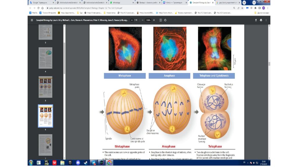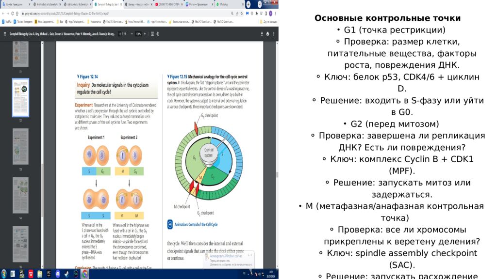 Основные контрольные точки G1 (точка рестрикции) Проверка: размер клетки, питательные вещества, факторы роста, повреждения ДНК. Ключ: белок p53, CDK4/6 + циклин D. Решение: входить в S-фазу или уйти в G0. G2 (перед митозом) Проверка: завершена ли репликация ДНК? Есть ли повреждения? Ключ: комплекс Cyclin B + CDK1 (MPF). Решение: запускать митоз или задержаться. M (метафазная/анафазная контрольная точка) Проверка: все ли хромосомы прикреплены к веретену деления? Ключ: spindle assembly checkpoint (SAC). Решение: запускать расхождение сестринских хроматид или ждать.