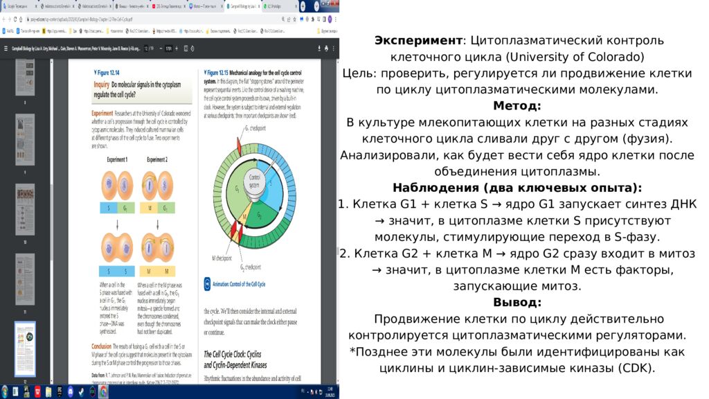 Эксперимент : Цитоплазматический контроль клеточного цикла (University of Colorado) Цель: проверить, регулируется ли продвижение клетки по циклу цитоплазматическими молекулами. Метод: В культуре млекопитающих клетки на разных стадиях клеточного цикла сливали друг с другом (фузия). Анализировали, как будет вести себя ядро клетки после объединения цитоплазмы. Наблюдения (два ключевых опыта): 1. Клетка G1 + клетка S → ядро G1 запускает синтез ДНК → значит, в цитоплазме клетки S присутствуют молекулы, стимулирующие переход в S-фазу. 2. Клетка G2 + клетка M → ядро G2 сразу входит в митоз → значит, в цитоплазме клетки M есть факторы, запускающие митоз. Вывод: Продвижение клетки по циклу действительно контролируется цитоплазматическими регуляторами. *Позднее эти молекулы были идентифицированы как циклины и циклин-зависимые киназы (CDK).