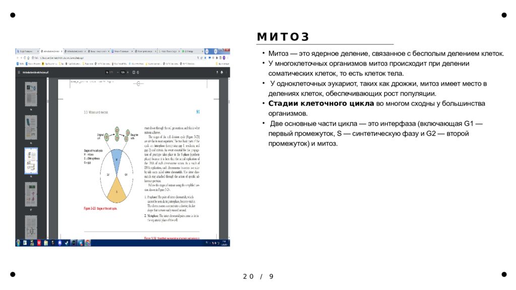 20 / 9 МИТОЗ Митоз — это ядерное деление, связанное с бесполым делением клеток. У многоклеточных организмов митоз происходит при делении соматических клеток, то есть клеток тела. У одноклеточных эукариот, таких как дрожжи, митоз имеет место в делениях клеток, обеспечивающих рост популяции. Стадии клеточного цикла во многом сходны у большинства организмов. Две основные части цикла — это интерфаза (включающая G1 — первый промежуток, S — синтетическую фазу и G2 — второй промежуток) и митоз.