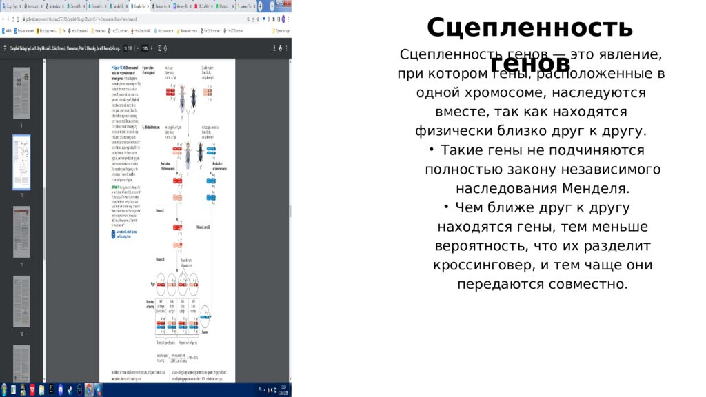 Сцепленность генов Сцепленность генов — это явление, при котором гены, расположенные в одной хромосоме, наследуются вместе, так как нах одятся физически близко друг к другу. Такие гены не подчиняются полностью закону независимого наследования Менделя. Чем ближе друг к другу находятся гены, тем меньше вероятность, что их разделит кроссинговер, и тем чаще они передаются совместно.