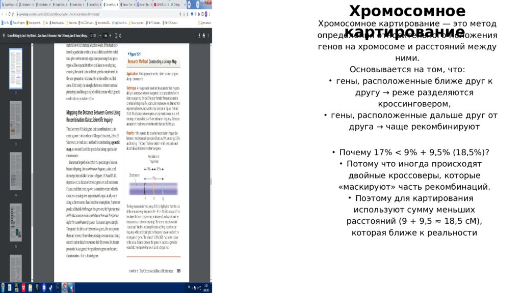 Хромосомное картирование Хромосомн ое картирование — это метод определения относительного положения генов на хромосоме и расстояний между ними. Основывается на том, что: гены, расположенные ближе друг к другу → реже разделяются кроссинговером, гены, расположенные дальше друг от друга → чаще рекомбинируют Поч ему 17% < 9% + 9,5% (18,5%)? Потому что иногда происходят двойные кроссоверы, которые «маскируют» часть рекомбинаций. Поэтому для картирования используют сумму меньших расстояний (9 + 9,5 ≈ 18,5 cM), которая ближе к реальности