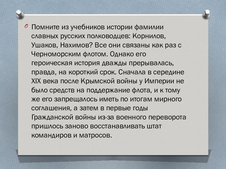 Помните из учебников истории фамилии славных русских полководцев: Корнилов, Ушаков, Нахимов? Все они связаны как раз с Черноморским флотом. Однако его героическая история дважды прерывалась, правда, на короткий срок. Сначала в середине XIX века после Крымской войны у Империи не было средств на поддержание флота, и к тому же его запрещалось иметь по итогам мирного соглашения, а затем в первые годы Гражданской войны из-за военного переворота пришлось заново восстанавливать штат командиров и матросов.
