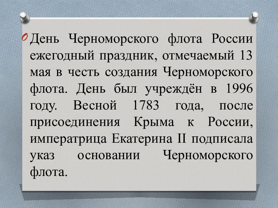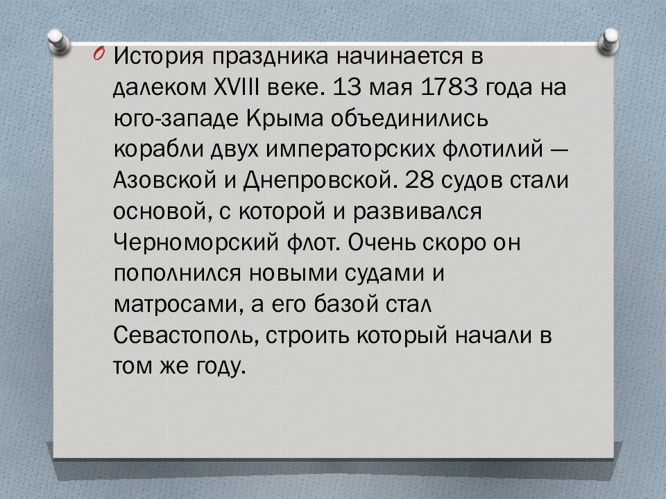 История праздника начинается в далеком XVIII веке. 13 мая 1783 года на юго-западе Крыма объединились корабли двух императорских флотилий — Азовской и Днепровской. 28 судов стали основой, с которой и развивался Черноморский флот. Очень скоро он пополнился новыми судами и матросами, а его базой стал Севастополь, строить который начали в том же году.