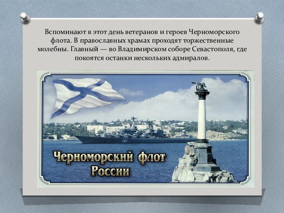 Слайд 11: Вспоминают в этот день ветеранов и героев Черноморского флота. В православных храмах проходят торжественные молебны. Главный — во Владимирском соборе Севастополя, где покоятся останки нескольких адмиралов