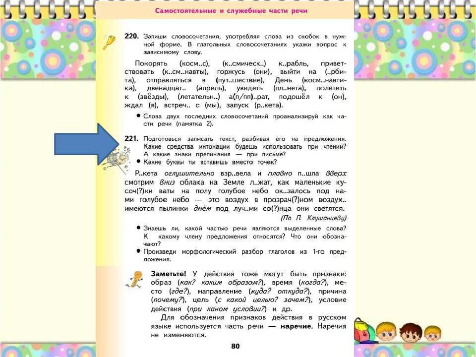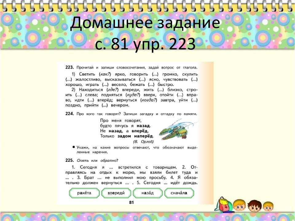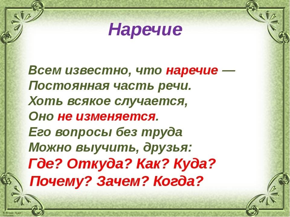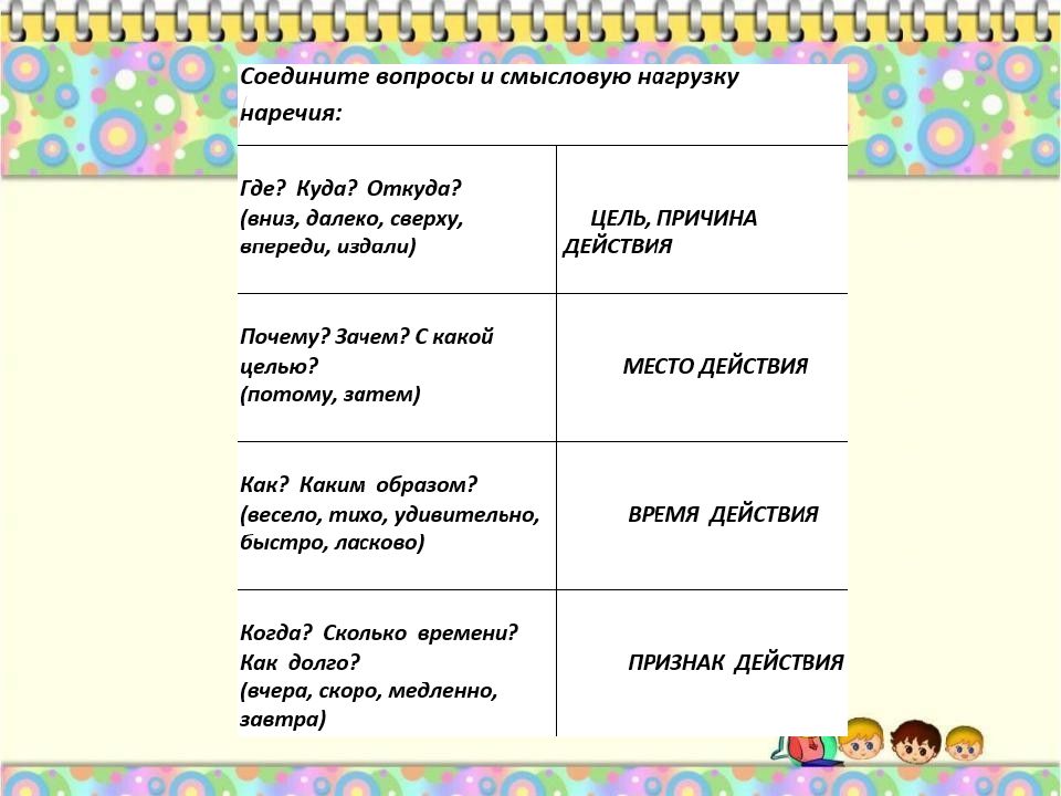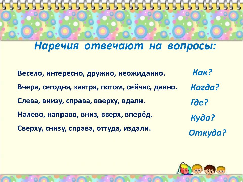 8 Весело, интересно, дружно, неожиданно. Вчера, сегодня, завтра, потом, сейчас, давно. Слева, внизу, справа, вверху, вдали. Налево, направо, вниз, вверх, вперёд. Сверху, снизу, справа, оттуда, издали. Наречия отвечают на вопросы: Как? Когда? Где? Куда? Откуда?