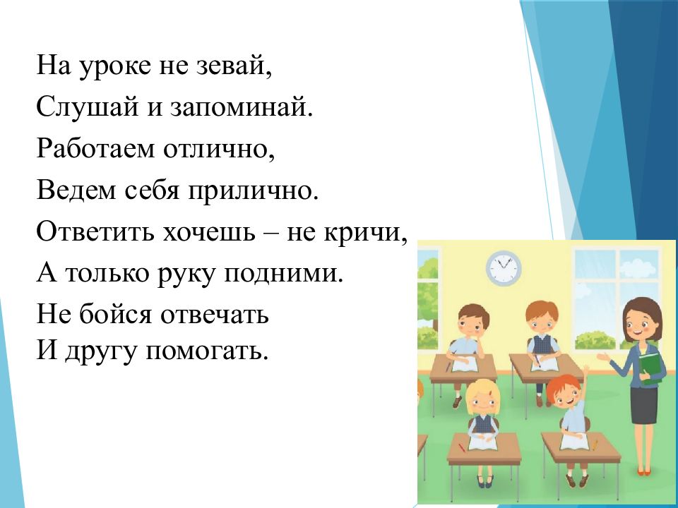 На уроке не зевай, Слушай и запоминай. Работаем отлично, Ведем себя прилично. Ответить хочешь – не кричи, А только руку подними. Не бойся отвечать И другу помогать.