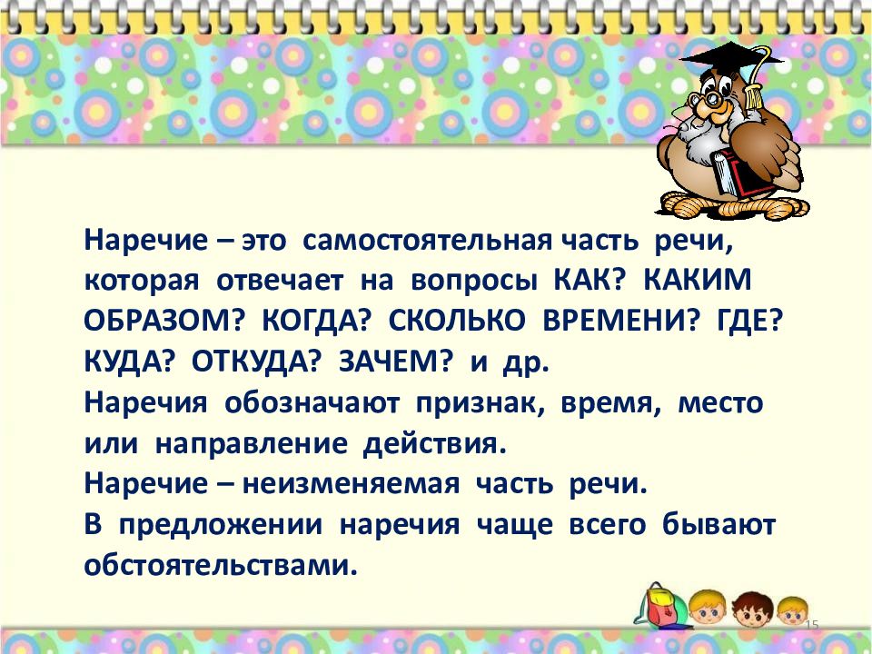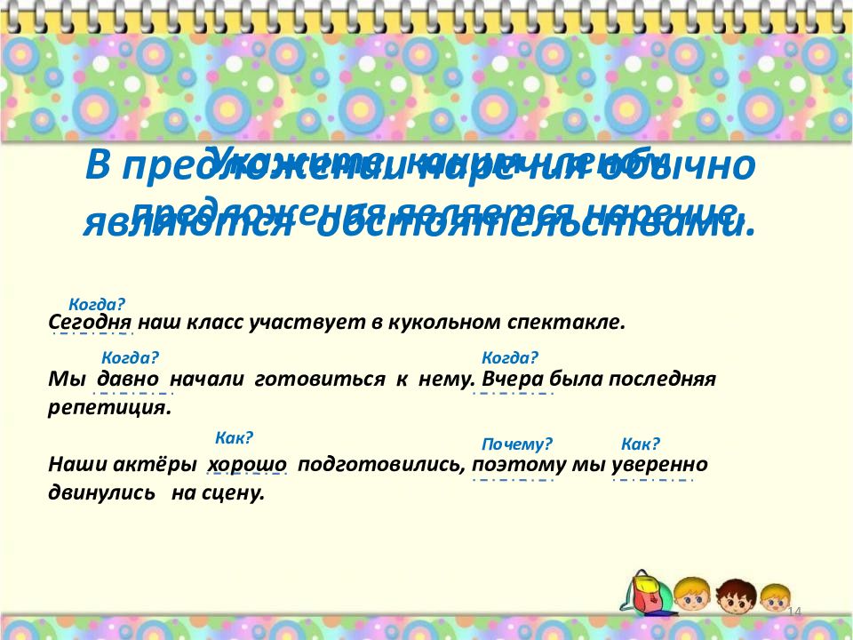 14 Сегодня наш класс участвует в кукольном спектакле. Мы давно начали готовиться к нему. Вчера была последняя репетиция. Наши актёры хорошо подготовились, поэтому мы уверенно двинулись на сцену. Укажите, каким членом предложения является наречие. Когда? Когда? Когда? Как? Почему? Как? В предложении наречия обычно являются обстоятельствами.