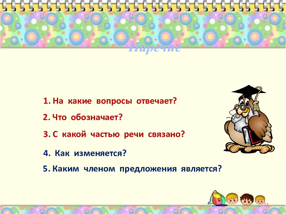 13 Наречие 1. На какие вопросы отвечает? 2. Что обозначает? 3. С какой частью речи связано? 4. Как изменяется? 5. Каким членом предложения является?