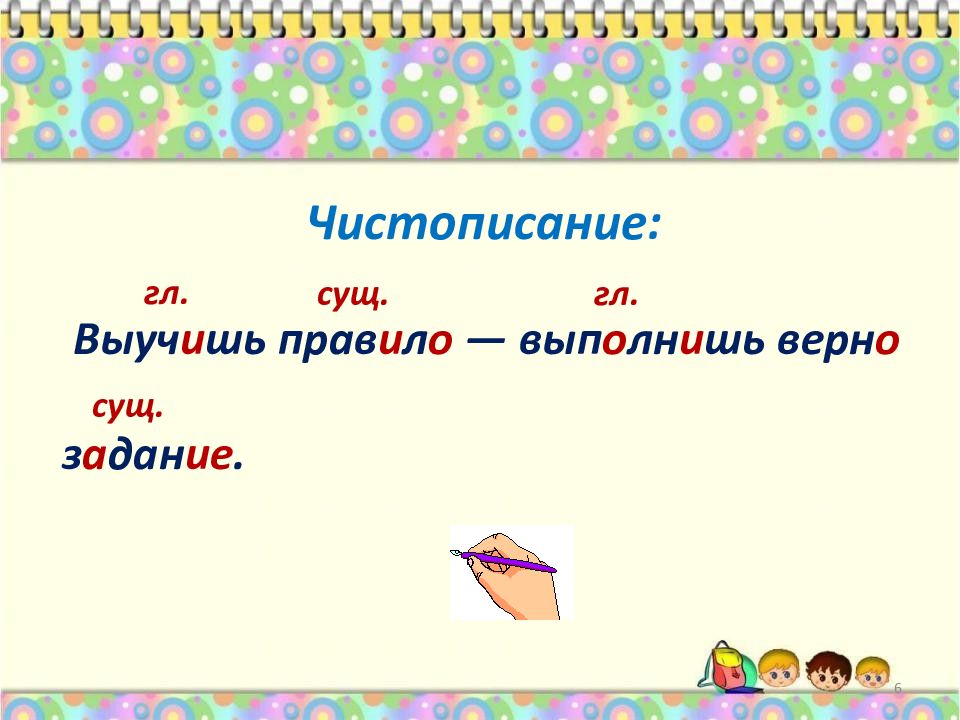 6 Выуч и шь прав и л о — вып о лн и шь верн о з а дан ие. Чистописание: гл. сущ. гл. сущ.