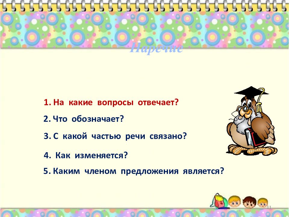 11 Наречие 1. На какие вопросы отвечает? 2. Что обозначает? 3. С какой частью речи связано? 4. Как изменяется? 5. Каким членом предложения является?