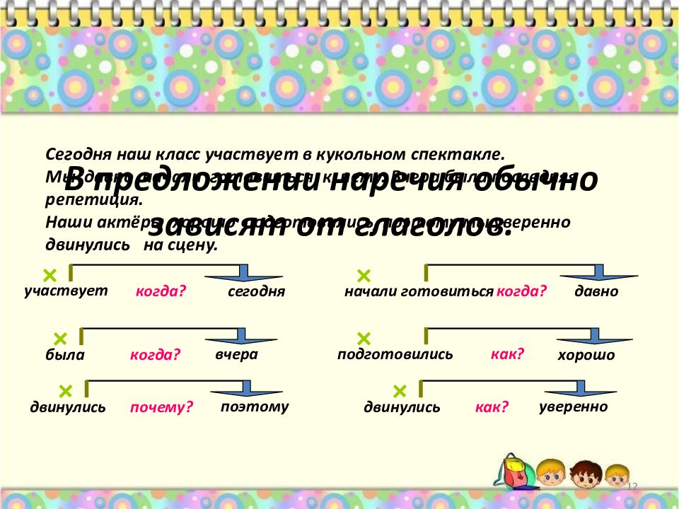 12 В предложении наречия обычно зависят от глаголов. участвует сегодня начали готовиться давно была вчера когда? когда? когда? Сегодня наш класс участвует в кукольном спектакле. Мы давно начали готовиться к нему. Вчера была последняя репетиция. Наши актёры хорошо подготовились, поэтому мы уверенно двинулись на сцену. подготовились хорошо как? двинулись поэтому почему? двинулись уверенно как?