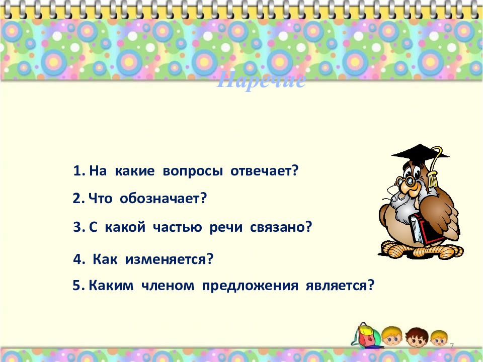 7 Наречие 1. На какие вопросы отвечает? 2. Что обозначает? 3. С какой частью речи связано? 4. Как изменяется? 5. Каким членом предложения является?
