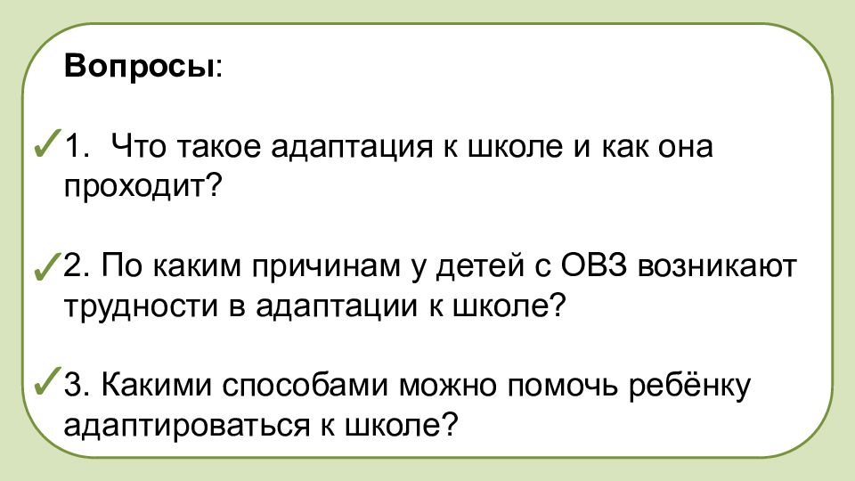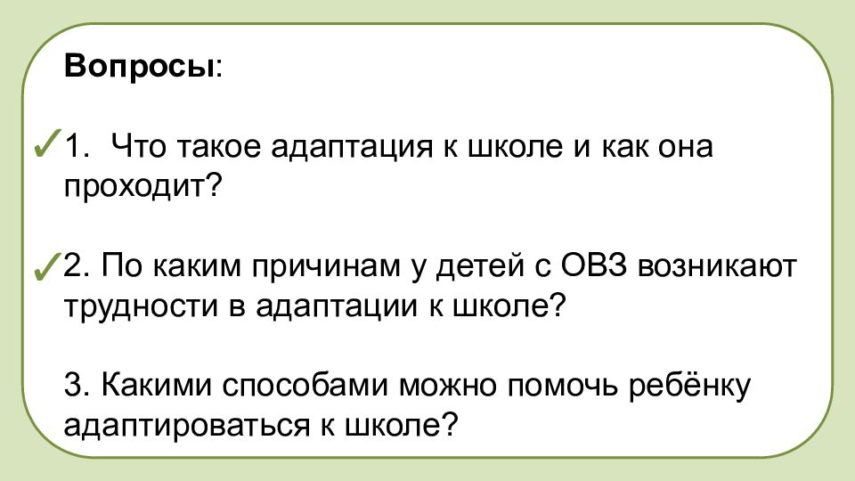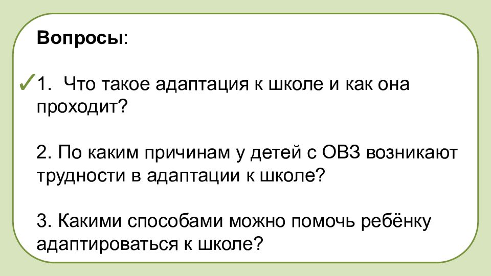 Вопросы : Что такое адаптация к школе и как она проходит ? 2. По каким причинам у детей с ОВЗ возникают трудности в адаптации к школе? 3. Какими способами можно помочь ребёнку адаптироваться к школе? ✓ ✓ ✓