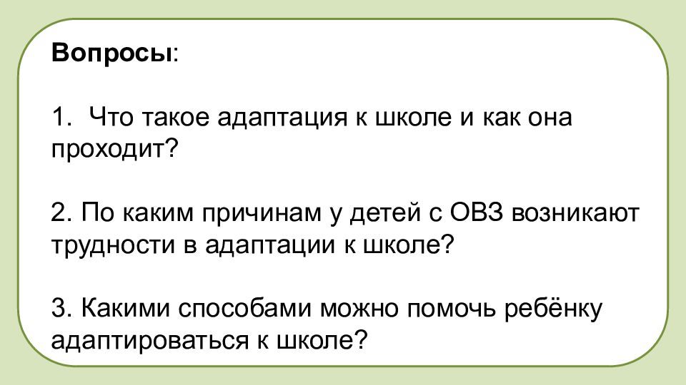 Вопросы : Что такое адаптация к школе и как она проходит ? 2. По каким причинам у детей с ОВЗ возникают трудности в адаптации к школе? 3. Какими способами можно помочь ребёнку адаптироваться к школе?