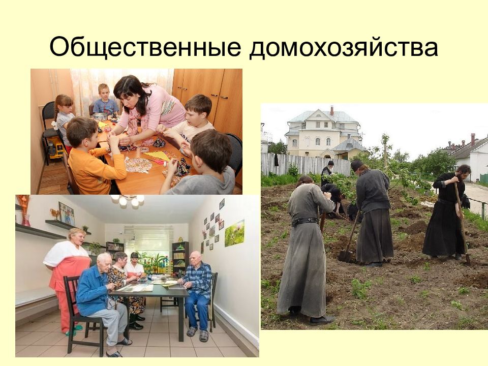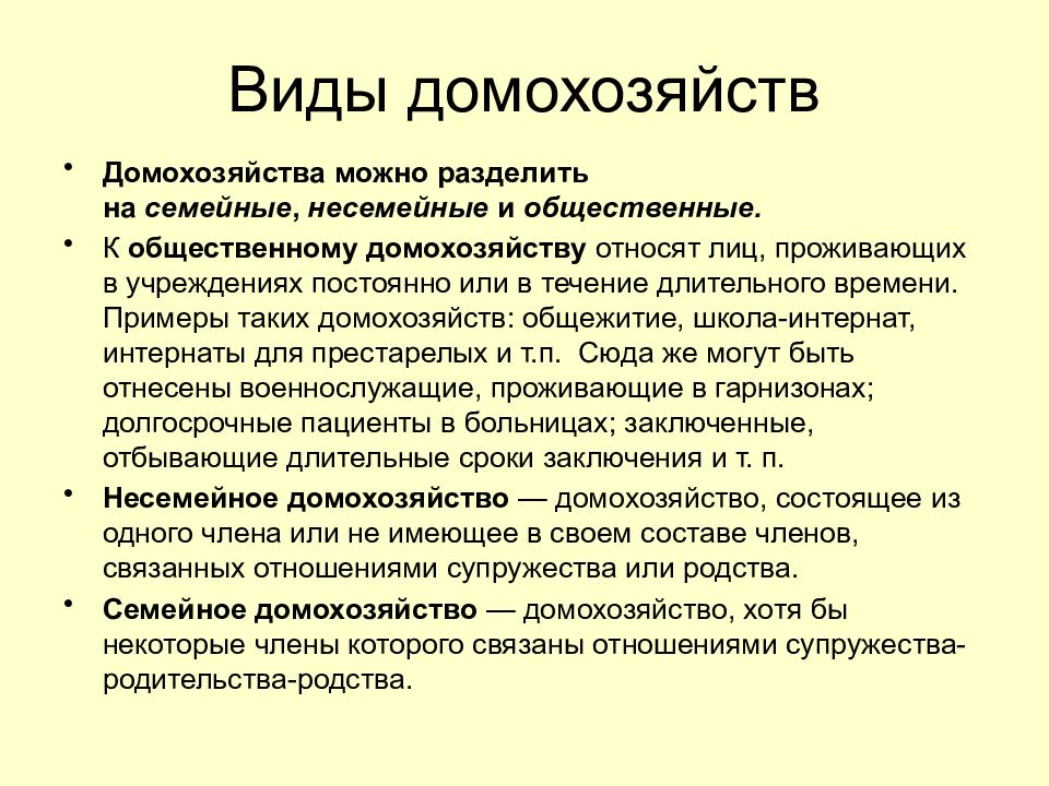 Домохозяйства можно разделить на семейные, несемейные и общественные. К общественному домохозяйству относят лиц, проживающих в учреждениях постоянно или в течение длительного времени. Примеры таких домохозяйств: общежитие, школа-интернат, интернаты для престарелых и т.п. Сюда же могут быть отнесены военнослужащие, проживающие в гарнизонах; долгосрочные пациенты в больницах; заключенные, отбывающие длительные сроки заключения и т. п. Несемейное домохозяйство — домохозяйство, состоящее из одного члена или не имеющее в своем составе членов, связанных отношениями супружества или родства. Семейное домохозяйство — домохозяйство, хотя бы некоторые члены которого связаны отношениями супружества- родительства-родства.
