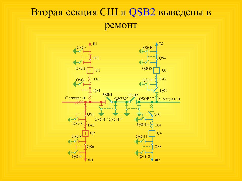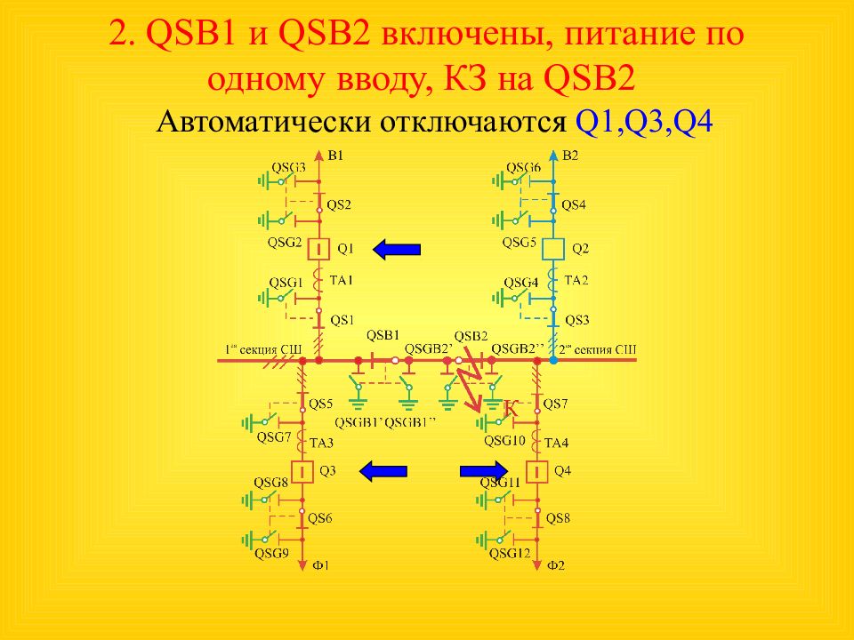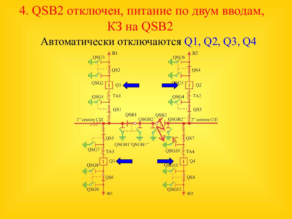 Слайд 16: 4. QSB2 отключен, питание по двум вводам, КЗ на QSB2