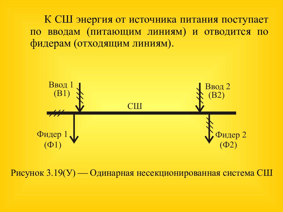 К СШ энергия от источника питания поступает по вводам (питающим линиям) и отводится по фидерам (отходящим линиям). Рисунок 3.19(У) Одинарная несекционированная система СШ
