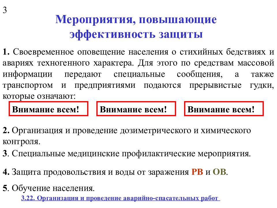 1. Своевременное оповещение населения о стихийных бедствиях и авариях техногенного характера. Для этого по средствам массовой информации передают специальные сообщения, а также транспортом и предприятиями подаются прерывистые гудки, которые означают: Внимание всем! Внимание всем! Внимание всем! 2. Организация и проведение дозиметрического и химического контроля. 3. Специальные медицинские профилактические мероприятия. 4. Защита продовольствия и воды от заражения РВ и ОВ. 5. Обучение населения. 3 3.22. Организация и проведение аварийно-спасательных работ