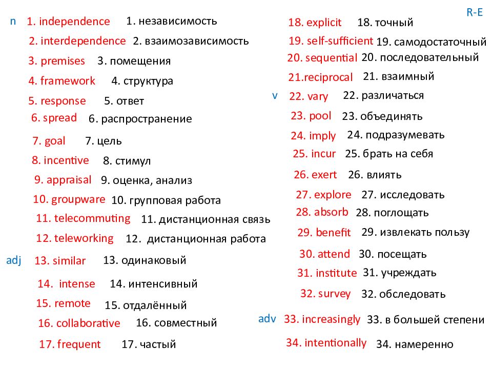 1. independence 2. interdependence 3. premises 4. framework 5. response 6. spread 7. goal 8. incentive 9. appraisal 10. groupware n 11. telecommuting 12. teleworking 13. similar 14. intense 15. remote adj 16. collaborative 17. frequent 1. независимость 2. взаимозависимость 3. помещения 4. структура 5. ответ 6. распространение 7. цель 8. стимул 9. о ценка, анализ 10. г рупповая работа 11. д истанционная связь 12. д истанционная работа 13. одинаковый 14. интенсивный 15. отдалённый 16. совместный 17. частый v 18. explicit 19. self-sufficient 20. sequential 21.reciprocal 22. vary 23. pool 24. imply 25. incur 26. exert 27. explore 28. absorb adv 29. benefit 30. attend 31. institute 3 3. increasingly 32. survey 34. intentionally 18. точный 19. самодостаточный 20. последовательный 21. взаимный 22. различаться 23. объединять 24. подразумевать 25. б рать на себя 26. вл иять 27. исследовать 28. поглощать 29. и звлекать пользу 30. посещать 31. учреждать 33. в большей степени 32. обследовать 34. намеренно E-R