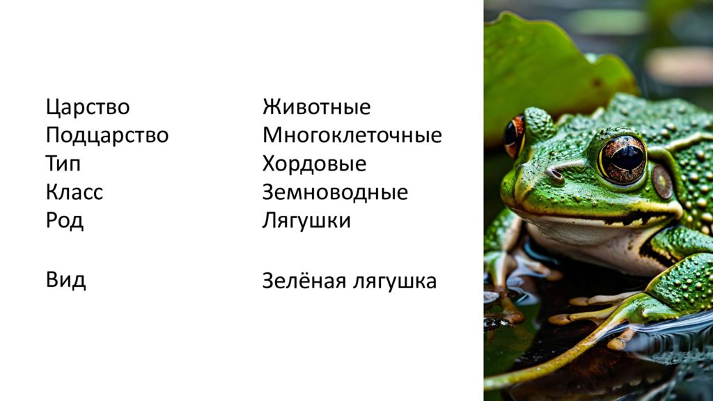 Царство Животные Подцарство Многоклеточные Тип Хордовые Класс Земноводные Род Лягушки Вид Зелёная лягушка