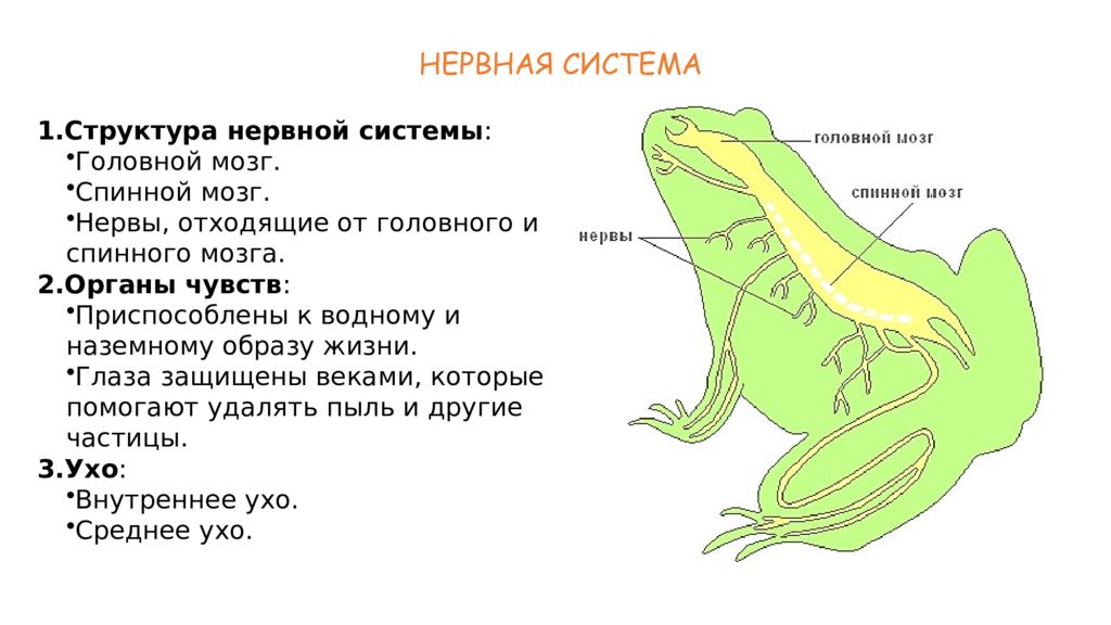 НЕРВНАЯ СИСТЕМА Структура нервной системы : Головной мозг. Спинной мозг. Нервы, отходящие от головного и спинного мозга. Органы чувств : Приспособлены к водному и наземному образу жизни. Глаза защищены веками, которые помогают удалять пыль и другие частицы. Ухо : Внутреннее ухо. Среднее ухо.