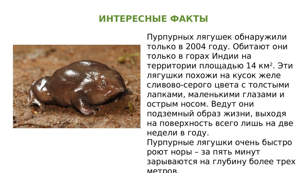 ИНТЕРЕСНЫЕ ФАКТЫ Пурпурных лягушек обнаружили только в 2004 году. Обитают они только в горах Индии на территории площадью 14 км 2. Эти лягушки похожи на кусок желе сливово -серого цвета с толстыми лапками, маленькими глазами и острым носом. Ведут они подземный образ жизни, выходя на поверхность всего лишь на две недели в году. Пурпурные лягушки очень быстро роют норы – за пять минут зарываются на глубину более трех метров.