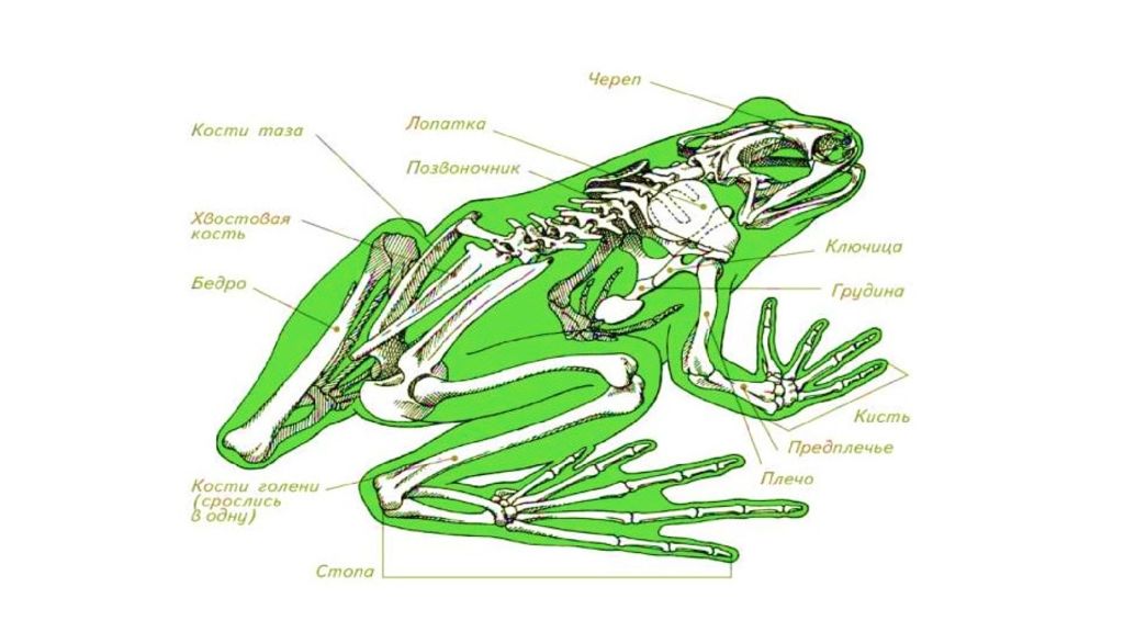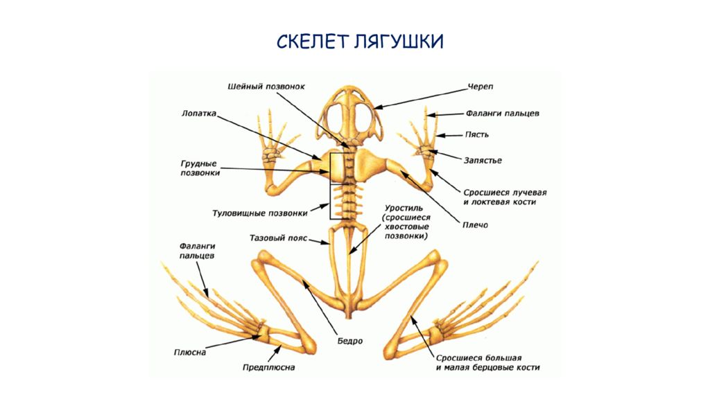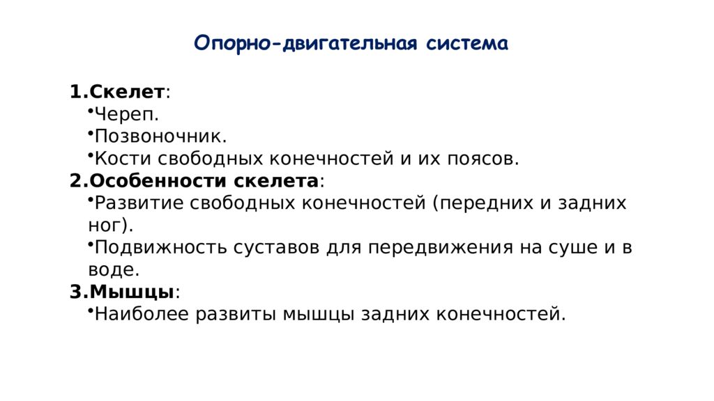Опорно-двигательная система Скелет : Череп. Позвоночник. Кости свободных конечностей и их поясов. Особенности скелета : Развитие свободных конечностей (передних и задних ног). Подвижность суставов для передвижения на суше и в воде. Мышцы : Наиболее развиты мышцы задних конечностей.