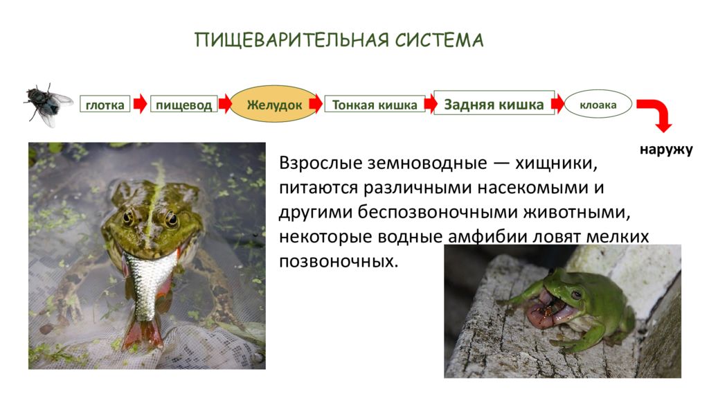 Взрослые земноводные — хищники, питаются различными насекомыми и другими беспозвоночными животными, некоторые водные амфибии ловят мелких позвоночных. глотка пищевод Тонкая кишка Задняя кишка Желудок клоака наружу ПИЩЕВАРИТЕЛЬНАЯ СИСТЕМА