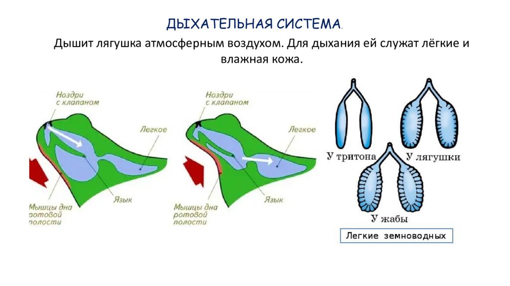 ДЫХАТЕЛЬНАЯ СИСТЕМА. Дышит лягушка атмосферным воздухом. Для дыхания ей служат лёгкие и влажная кожа.