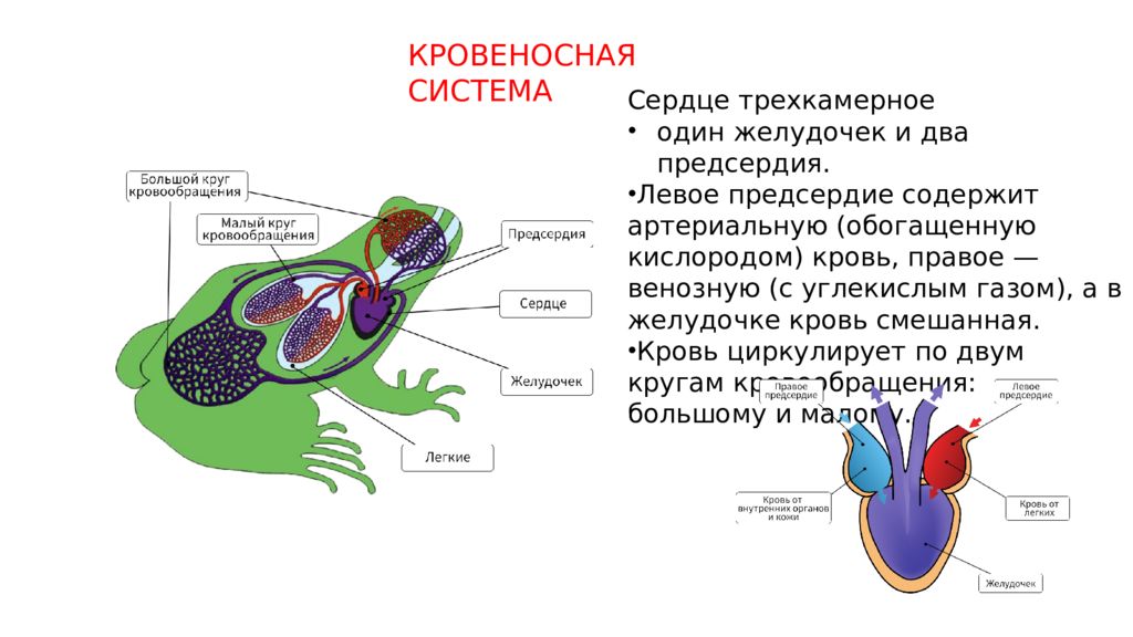 Сердце трехкамерное один желудочек и два предсердия. Левое предсердие содержит артериальную (обогащенную кислородом) кровь, правое — венозную (с углекислым газом), а в желудочке кровь смешанная. Кровь циркулирует по двум кругам кровообращения: большому и малому. КРОВЕНОСНАЯ СИСТЕМА